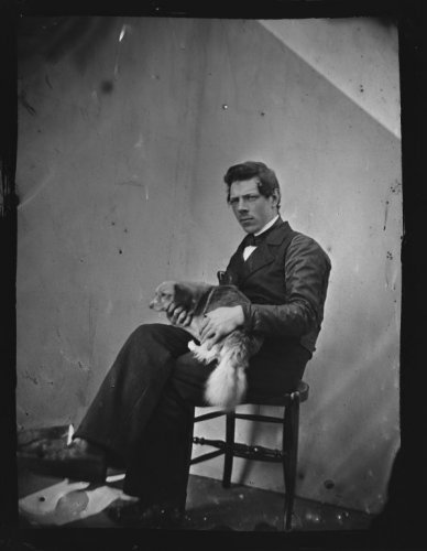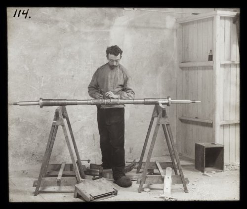 In de collectie zijn ook opmerkelijke portretten te vinden van wat destijds eigenzinnige mensen moeten zijn geweest, zoals een man die tegendraads zijn hond op schoot neemt voor de nette portretfoto. En zelfs tamelijk ‘saaie’ of ‘simpele’ taferelen kunnen met wat uitleg interessant worden. Neem de foto hieronder, een man die wat aan het klussen is? Nee, deze man is niet zo maar een klusser, hij is ambachtelijk bezig met het vervaardigen van een onderdeel van wat later bekend zal worden als de Gouden Koets. Elk onderdeel van de koets waarvoor hij verantwoordelijk was heeft hij met veel aandacht en toewijding gemaakt. Het zal een hoogtepunt zijn geweest in zijn carrière, zo niet het toppunt. Zijn naam staat er niet bij, zoals zovelen is hij anoniem de geschiedenis ingegaan.